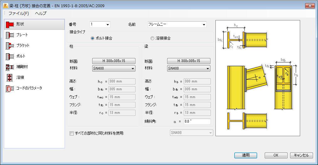 Note: The number of tabs in this dialog depends on a selected connection type: bolted or welded.