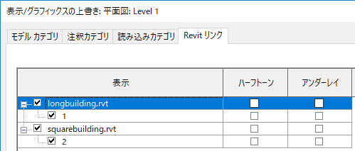 Revit リンク モデルの表示とグラフィックスをコントロールするパラメータは、[表示/グラフィックスの上書き]ダイアログの独自のタブである[Revit リンク]にグループ化されています。
