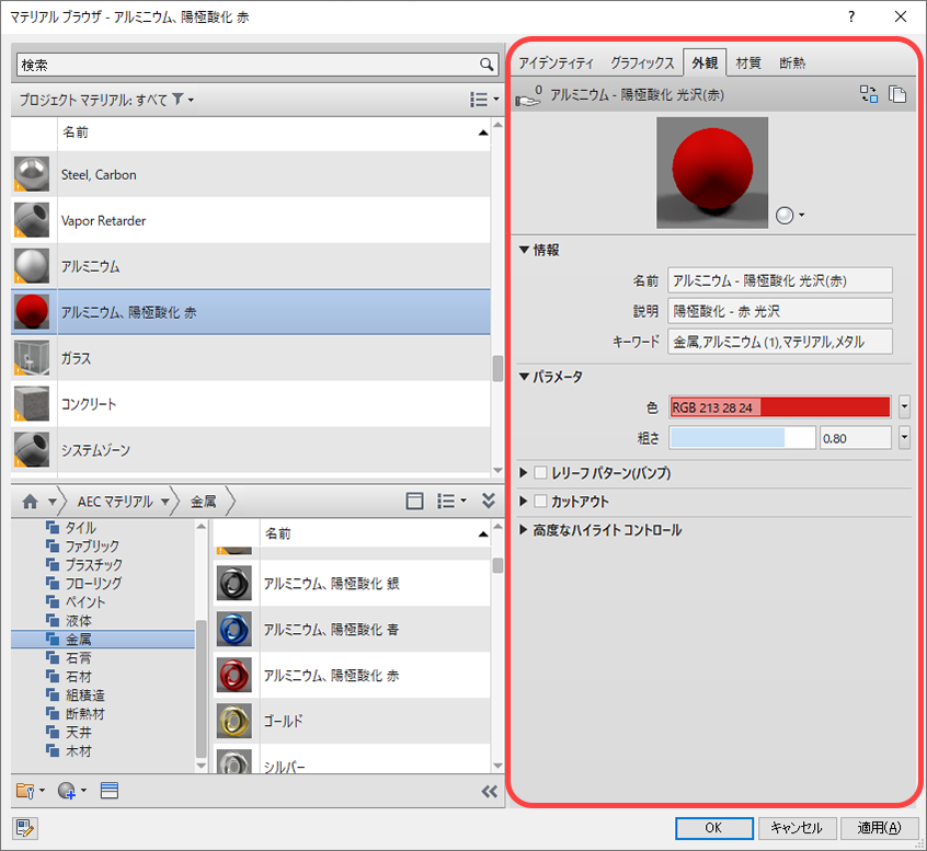 この情報は、マテリアル ブラウザの[マテリアル エディタ]パネルにある[識別]、[グラフィックス]、[外観]タブに表示されます。