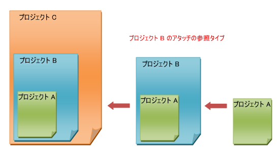 プロジェクト A の参照タイプ設定を(親モデルであるプロジェクト B 内で)[アタッチ]に変更した場合は、プロジェクト B をプロジェクト C に読み込むと、ネストされたリンク(プロジェクト A)が表示されます。