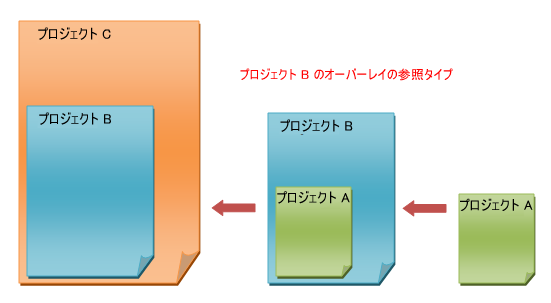 次の画像は、プロジェクト A がプロジェクト B にリンクされていることを示しています(したがってプロジェクト B がプロジェクト A の親モデルです)。プロジェクト A の参照タイプ設定は、その親モデル(プロジェクト B)で[オーバーレイ]に設定されています。プロジェクト B をプロジェクト C に読み込んでも、プロジェクト A は表示されません。