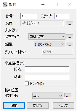 梁の部材タイプの作成と、その座標の定義は[部材]ダイアログ ボックスで行います。このダイアログ ボックスを開くには、次の 3 とおりの方法があります。