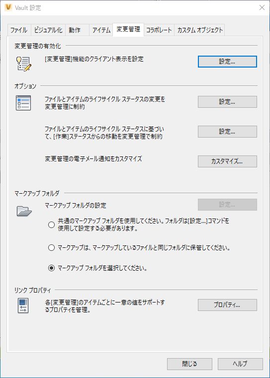 [Vault 設定]ダイアログ ボックスの[変更管理]タブで変更管理の動作を設定します。