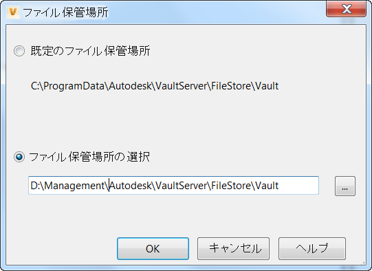 Autodesk Data Management Server ではなく、1 つまたは複数の Vault を有効にして File Server を使用すると、[ファイル保管場所]ダイアログ ボックスでファイル保管場所を更新できるようになります。