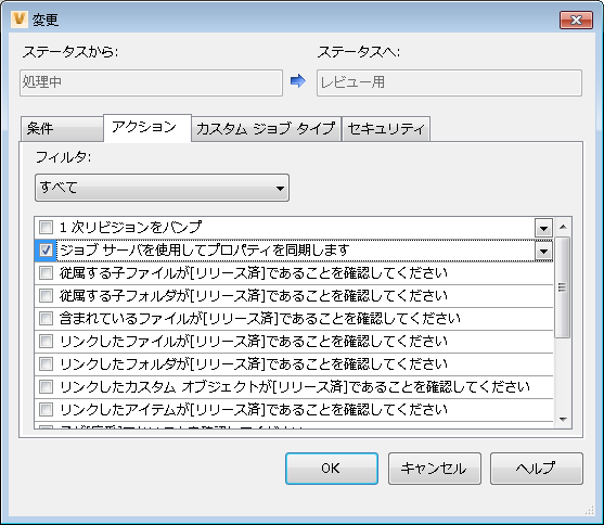 特定のライフサイクル ステータスが変更されるたびに、プロパティの同期、および処理を行うジョブ サーバへのファイル送信が自動的に実行されるように、ライフサイクルを設定することができます。
