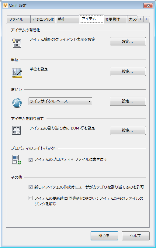 [Vault 設定]をクリックします。 [Vault 設定]ダイアログ ボックスの[アイテム]タブには、計測単位、透かしの基本設定の管理、BOM 行の設定、アイテムでの関連ファイルへのプロパティの書き戻しの有効化に関するオプションがあります。アイテムの機能を無効にすることもできます。