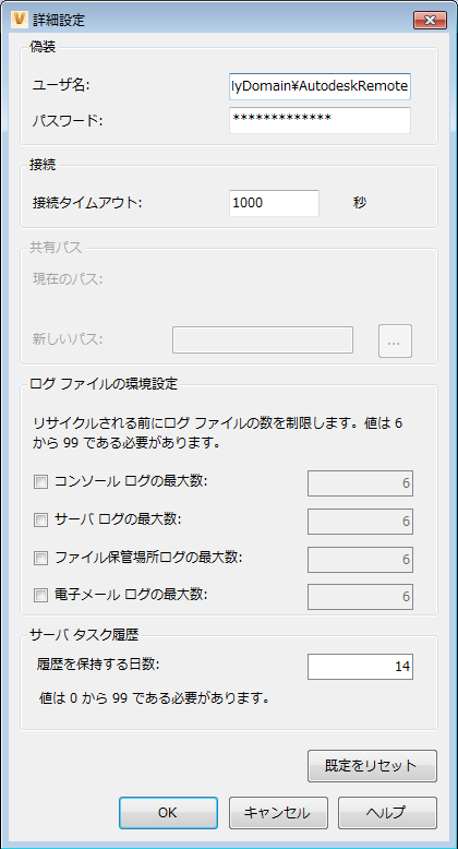 - [詳細設定]ダイアログ ボックスで、ユーザ名を MyDomain¥AutodeskRemote に変更し、ユーザ名に対応するパスワードを入力します。