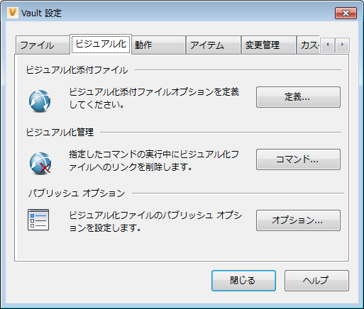 [Vault 設定]ダイアログ ボックスの[ビジュアル化]タブには、ビジュアル化添付ファイルの設定、ビジュアル ファイル管理、およびパブリッシュ設定に関するオプションがあります。