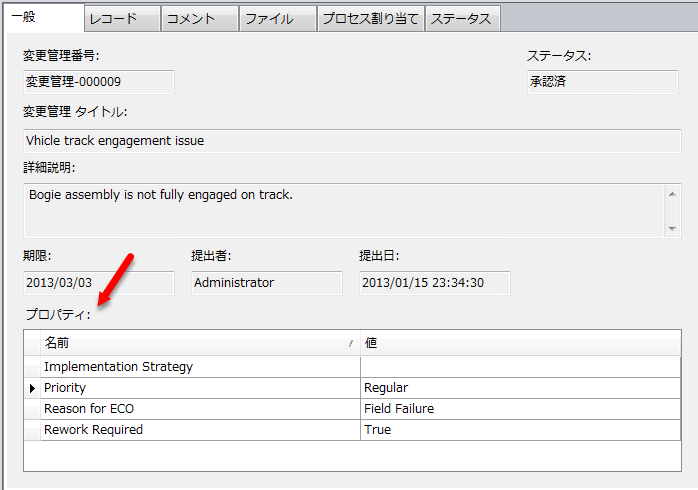既定のプロパティ(変更管理番号、変更管理タイトル、説明など)に追加して、プロパティを定義することができます。追加のプロパティを使用するには、事前に管理者が追加のプロパティを設定する必要があります。