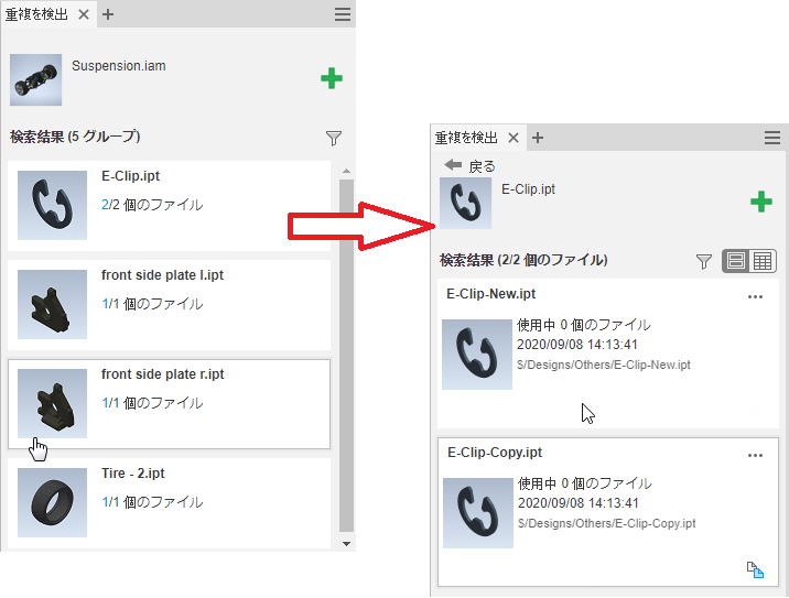 個々の重複パーツを表示するには、目的のグループ結果をクリックします。