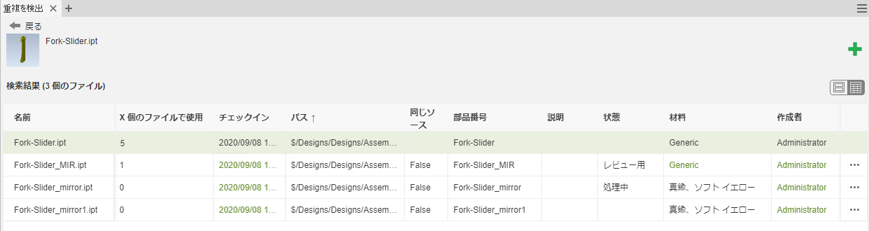 Inventor 2020.2 リリース以降、重複パーツを確認するダブルチェック メカニズムが実装されました。最も正確な結果を得るには、Inventor 2020.2 以降に更新してください。
