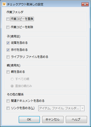 [チェックアウトを取り消し]ダイアログ ボックスを非表示にすると、該当する Vault 操作が関連ファイルにどのように影響するかを指定できます。