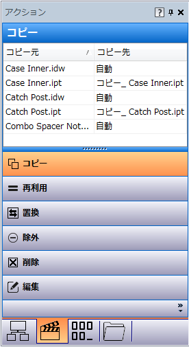 [アクション]パネルでは、メイン ビューのファイルに対して実行するよう割り当てられている操作を確認できます。 メイン ビューでファイルの設定が完了したら、[アクション]パネルを使用して、割り当てられた操作を基準にファイルをフィルタできます。割り当てられる操作には、コピー、再利用、置換、除外、削除、編集があります。 注: また、メイン グリッドから[アクション]パネルの目的の操作ボタンにファイルをドラッグ アンド ドロップして、アクションの操作を設定することもできます。