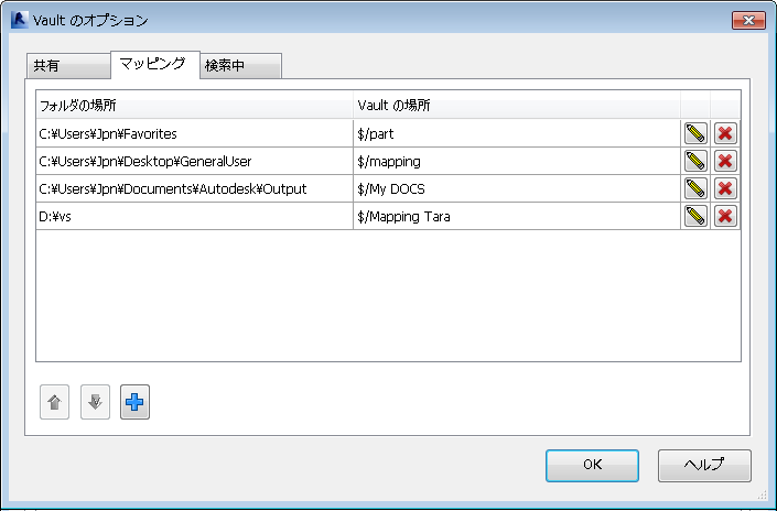 [Vault のオプション]ダイアログ ボックスの[マッピング]タブで、ローカル フォルダ、ネットワーク フォルダ、または Revit Server フォルダを Vault フォルダにマッピングします。