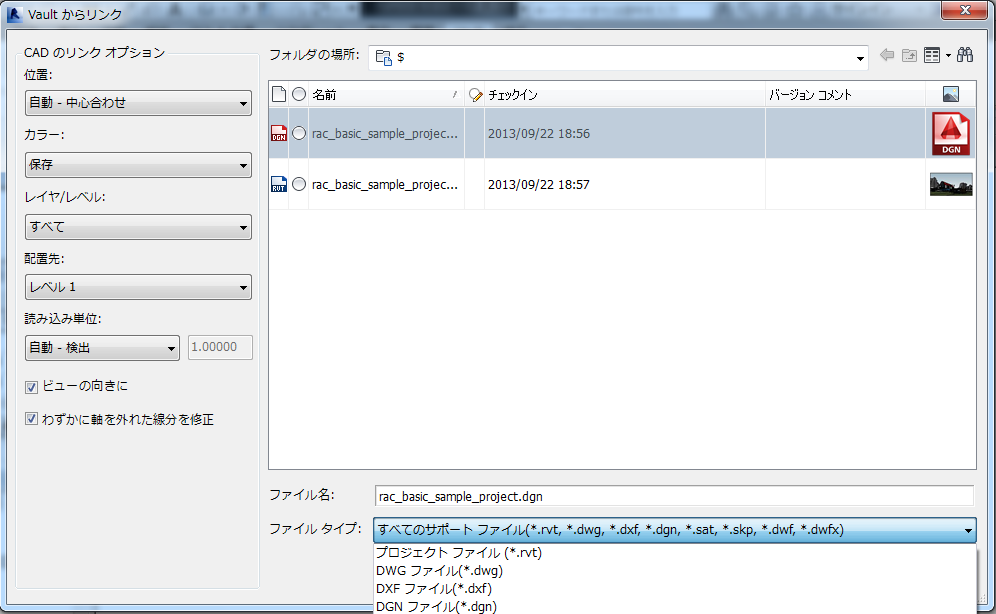 [Vault からリンク]ダイアログ ボックスでは、現在の Revit プロジェクトにリンクするファイルを Vault から選択し、リンクするファイルの位置オプションを指定することができます。