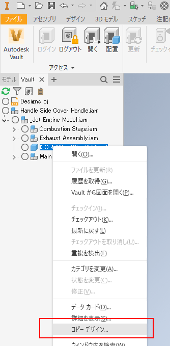 - Inventor で、Vault ブラウザのファイルを右クリックし、[Copy Design]をクリックします。