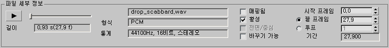 끝 프레임재생이 중지되는 프레임입니다. 기본적으로 이 프레임은 0.0+(프레임 단위의 샘플 길이)입니다. 예를 들어 길이가 50 프레임인 샘플은 시작 프레임 0.0과 끝 프레임 50.0을 가집니다. 트랙 뷰에서 샘플의 키나 트랙을 조작하는 경우(이동, 슬라이드 등) 이 개수가 자동으로 조정됩니다.