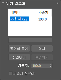 기본적으로, 나열된 각 제어기의 가중치는 100.0으로 설정되어 있습니다. 이 설정을 변경하여 제어기가 오브젝트에 미치는 효과를 증가 또는 감소시킬 수 있습니다.