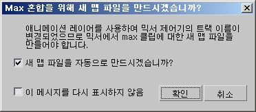 그러나 새 맵 파일을 자동으로 만드시겠습니까?를 끄면 확인을 클릭하기 전에는 맵 파일이 생성되지 않고 다음에 장면 파일을 열 때 맵 파일을 만들라는 메시지가 표시됩니다. 맵 파일이 없으면 애니메이션이 올바르게 나타나지 않습니다.