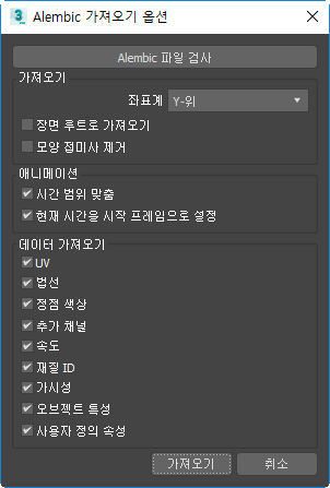 - Y-위 또는 Z-위 좌표계에 Alembic 형상을 가져옵니다.