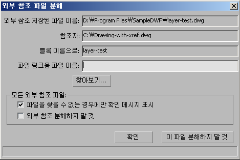 외부 참조 파일 분해 대화상자는 3ds Max가 첨부된 DWG 파일에 필요한 외부 참조 파일을 찾을 수 없을 때 표시됩니다.