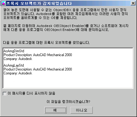 파일 링크 관리자를 사용하여 DWG 파일을 장면에 첨부할 때 프록시 오브젝트가 감지되었습니다 대화상자가 표시될 수 있습니다. 즉, 3ds Max에서 오브젝트를 편집하려면 도면에 특수 Object Enabler가 필요한 사용자 정의 오브젝트가 있음을 의미합니다.