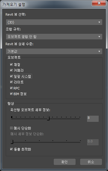 Revit 파일을 가져오기 위한 옵션을 제공합니다.
