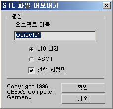 STL 출력 파일이 바이너리인지 또는 ASCII(문자) 데이터인지를 선택합니다. ASCII STL 파일은 바이너리 STL 파일보다 훨씬 큽니다.