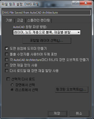 파일 링크 설정: DWG 파일 대화상자의 고급 패널은 3ds Max에서 AutoCAD 원형을 파생하는 방법 및 3ds Max에서 AutoCAD 도면에 연결하거나 다시 로드할 때 장면 재질 정의를 사용할지 여부를 제어합니다. 또한 선택적으로 장면을 다시 로드하여 전체 파일이 아니라 특정 오브젝트만 다시 로드할 수 있도록 합니다.
