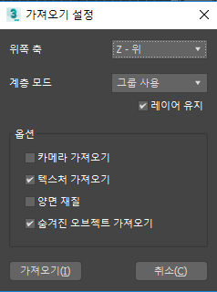 - 응용프로그램마다 다른 축이 위쪽 축으로 사용됩니다. 가져올 파일에 적절한 축을 선택하십시오. 기본값은 Z - 위입니다.