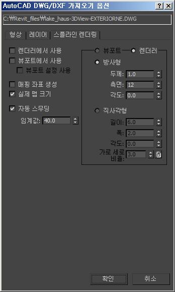 가져오기 옵션 대화상자의 스플라인 렌더링 패널을 사용하여 DWG 및 DXF 파일에서 가져온 스플라인 오브젝트가 뷰포트에 표시되는 방법 및 3ds Max 렌더러에서 처리되는 방법을 결정할 수 있습니다.
