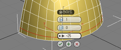 3ds Max에서 선택한 가장자리 주위에 단일 루프 가장자리가 그려집니다. 또한 연결 도구에 대한 "캐디" 컨트롤이 표시됩니다.