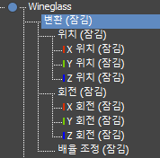 잠금 해제된 모든 항목이 활성화되어 있으면 규칙 롤아웃의 맨 아래에 있는 네 개의 아이콘 버튼을 사용하여 모든 수정자, 재질, 변환 및 오브젝트를 신속하게 잠글 수 있으며 이전처럼 편집 버튼을 사용하여 특정 트랙을 잠글 수도 있습니다. 편의상 이 연습에서는 포도주 잔에 대해 기존의 잠긴 변환 트랙만 사용합니다.