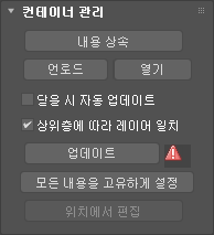 상속된 컨테이너가 열려 있는지, 닫혀 있는지에 따라 수정 패널에는 로컬 내용 또는 내용 상속 롤아웃이 표시됩니다. 둘 다 표시되지는 않습니다.