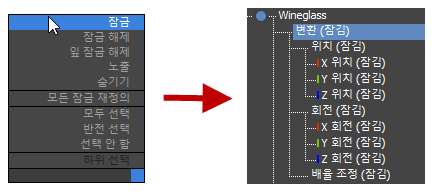 트랙 뷰 계층에 있는 변환 항목과 모든 하위(가지와 잎)의 이름 뒤에 "(잠금)"이라고 표시됩니다.