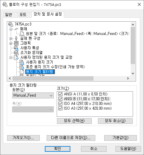 프린터 성능에 맞게 표준 용지 크기의 인쇄 가능 영역을 조절합니다. (플로터 구성 편집기에서는 Windows 시스템 프린터의 사용자 용지 크기를 작성할 수 없습니다.)