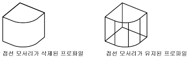 접선 모서리가 표시되는지 여부를 결정합니다. 접선 모서리는 접하는 두 면 사이의 전환 선입니다. 접선 모서리는 이 선에서 두 면이 만나고 접하는 가상의 모서리입니다. 예를 들어, 상자의 모서리를 모깎기하면 모깎기의 원통형 면이 상자의 편평면에 혼합되는 지점에 접선 모서리가 작성됩니다. 접선 모서리는 대부분의 제도용 응용프로그램에서 표시되지 않습니다.