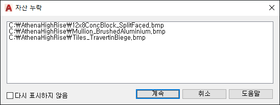 이 대화상자는 텍스처 맵의 경로가 더 이상 현재가 아닌 장면을 렌더할 때 나타납니다. 텍스처 맵이 이동 또는 삭제되었거나 드라이브 매핑이 다른 컴퓨터로 도면 파일을 이동한 경우 이러한 현상이 발생할 수 있습니다.