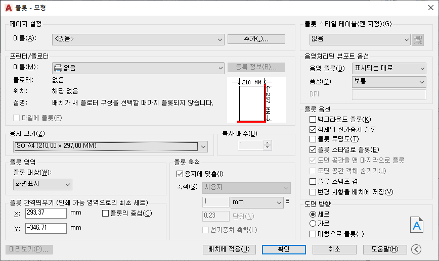 도면에서 플롯할 부분을 지정합니다. 플롯 대상에서 플롯될 도면의 영역을 선택할 수 있습니다.