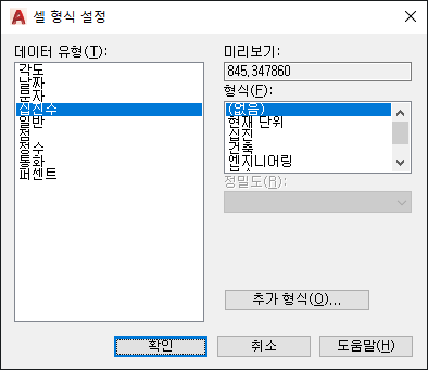 각도, 십진수, 점 및 정수 데이터 형식에 한해 테이블 셀에 추가 형식 옵션을 설정할 수 있는 추가 형식 대화상자가 열립니다.