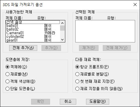 지정된 3D Studio(3DS) 파일에 있는 모든 객체의 이름을 표시합니다. 최대 70개의 객체를 선택할 수 있습니다.