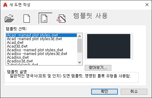 옵션 대화상자에서 지정한 도면 템플릿 파일 위치에 현재 있는 DWT 파일을 모두 나열합니다. 새 도면의 출발점으로 사용할 파일을 선택합니다.