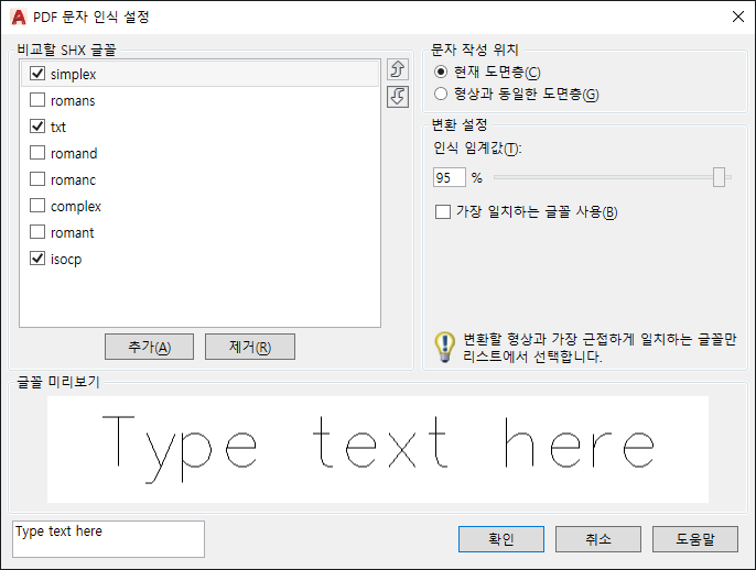 PDF 파일에서 가져온 SHX 형상을 개별 여러 줄 문자 객체로 변환하기 위한 옵션을 설정합니다.