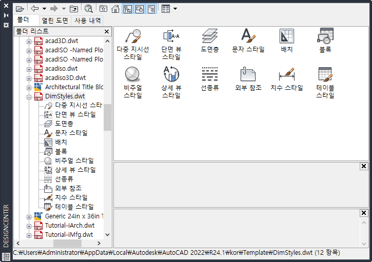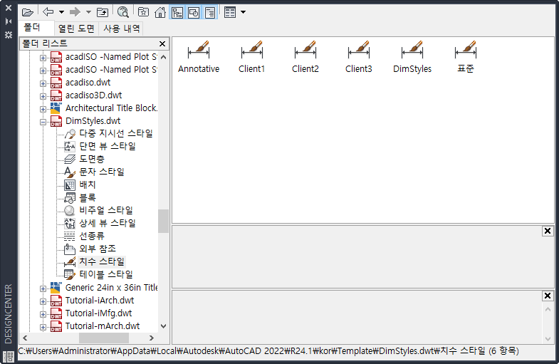 다른 도면 또는 도면 템플릿에서 여러 치수 스타일을 가져오려면 Design Center를 사용합니다.