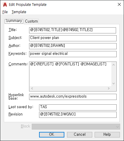 | @[block.attributeTag] | 속성 블록에서 속성 태그 값을 추출하여 지정된 필드에 삽입합니다. 예를 들어 작성자 필드에 @[title.drawnby]를 삽입하면 Propulate가 도면에서 속성 블록 명명된 제목을 검색하고, drawnby 속성 필드 값을 추출하여 도면의 도면 특성 대화상자에 있는 작성자 필드에 삽입합니다. 전체 프로젝트에서 공통 블록을 사용하는 경우에는 더 많은 도면에서 해당 특정 속성 값을 반영하도록 업데이트하는 작업이 간편해집니다. |