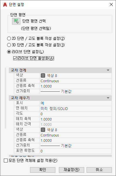 선택할 경우 모든 설정을 도면의 모든 단면 객체에 적용합니다. 선택하지 않을 경우 현재 단면 객체에만 설정을 적용합니다.