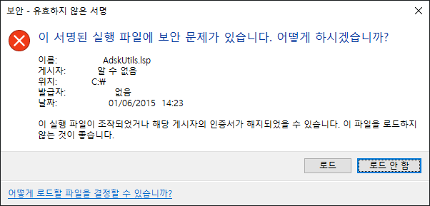 디지털 서명된 사용자 프로그램 파일을 로드할 때 AutoCAD 기반 프로그램은 파일에 부착된 디지털 서명을 확인합니다. 디지털 서명을 확인할 수 있었는지 여부에 대한 메시지 상자가 표시됩니다. 이 메시지를 보고 사용자는 프로그램 파일을 도면 환경에 로드하거나 로드하지 않을 수 있습니다.