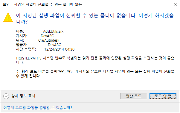 해결 방법: 예상대로 파일을 로드하여 사용합니다. 필요에 따라, 게시자가 서명한 모든 파일에 대해 앞으로 메시지 상자가 표시되지 않도록 게시자를 신뢰할 수도 있습니다.