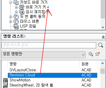 • 바로 가기 키를 작성하려면 명령 리스트 창에서 <파일 이름>의 사용자화 창의 바로 가기 키 노드로 명령을 끌어옵니다.