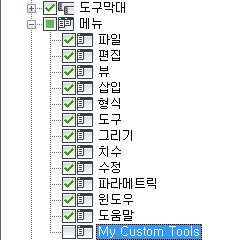 - <파일 이름>의 사용자화 창에서 도구막대 노드 옆에 있는 더하기 기호(+)를 클릭하여 노드를 확장합니다.